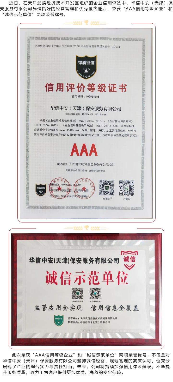 【喜报】华信中安天津公司荣获武清开发区“AAA信用等级企业”及“诚信示范单位”双项荣誉
