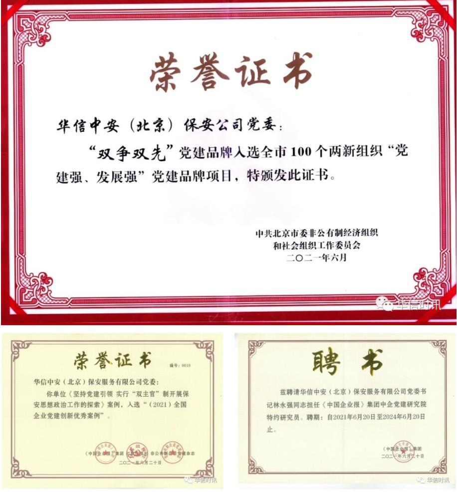 学习交流之后,集团党委书记林永强同志在党委上年度工作报告中指出:“过去的一年,是非凡的一年,在中国共产党成立百年之际,在上级领导下,在殷卫宏董事长关怀指导下,华信中安党的建设取得了可喜的成绩。华信中安党委以争创先进集体、争做先进个人为主线的“双争双先”活动,被评为北京市社会领域100个党建强、发展强“双强”党建品牌;华信中安党委《坚持党建引领,实行“双主官”制,开展保安思想政治工作的探索》被评为全国企业党建创新优秀案例,我本人也被中国企业党建研究院聘为特约研究员,成为全国首批6名特约研究员之一;李贤宝委员先后被评为“北京市最美退役军人”、北京榜样上榜人物、全国优秀保安员。同时,基层党建质量也有了明显提升,海外党总支、辽宁子公司党支部、广西子公司党支部等单位注重创新,较好地发挥了党组织的战斗堡垒作用和党员的先锋模范作用。”