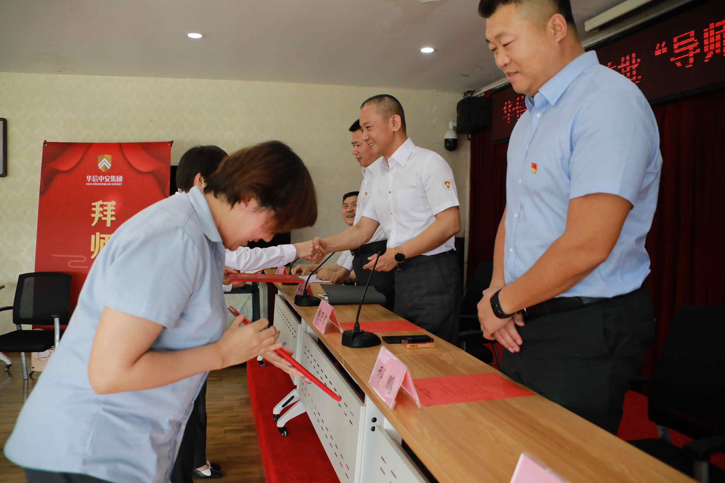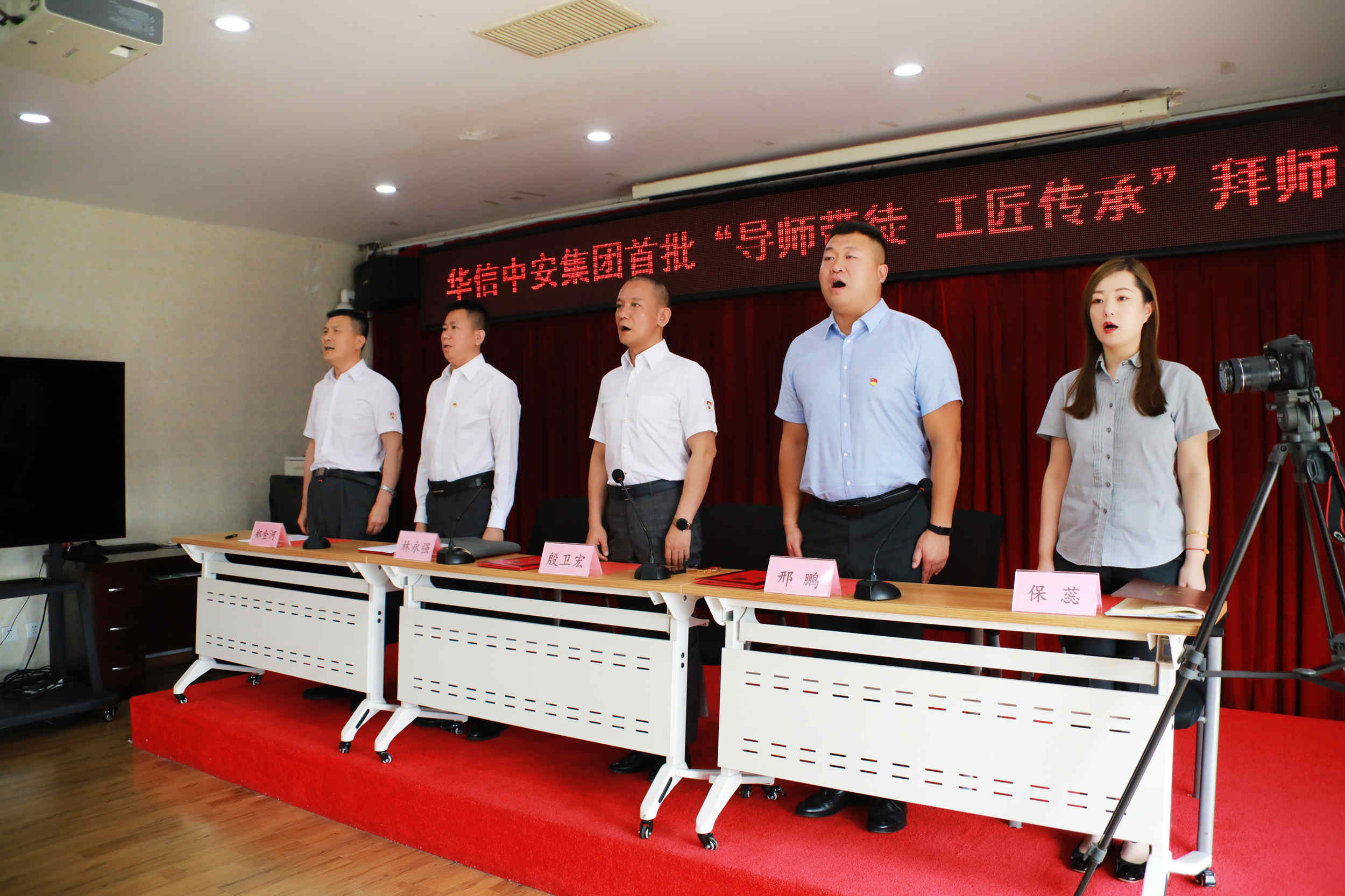 在庄严的国歌声后,拜师仪式正式拉开帷幕。首先,由华信中安党委书记林永强宣读了经过修改完善后的《"导师带徒 工匠传承"师徒管理制度实施方案》,方案中在明确规定了选师范围、选徒范围、带徒周期、师傅竞选程序,进一步明确了师傅和徒弟的责任与权利,学徒出徒的各项要求和出徒的标准。规定师傅职责包括:制订徒弟的学习和培训计划,传授从事本职业所需的理论知识和实操技能,帮助徒弟学习理解各项规章制度、岗位职责、工作方法,保证徒弟能够胜任岗位;帮助徒弟熟悉并适应工作和生活环境,引导徒弟理解并认同企业文化,快速融入公司和团队;关注徒弟的思想动态,从工作、生活上给予关心、爱护和帮助,为人处事起到模范榜样作用,帮助其树立正确的职业发展观;定期向主管领导汇报徒弟的学习进度、工作表现和思想动态,并根据其现实表现向上级提出对其予以调岗、处分、晋升或辞退等合理化建议。徒弟职责包括:遵守法律法规和公司的各项规章制度,安心本职工作,能吃苦耐劳、团结同事,时刻维护公司的利益和荣誉;须树立积极正确的学习工作态度,在工作中服从师傅正常的业务学习安排,认真向师傅学习岗位技能、理论知识和工作方法并加以运用,严格按规范和程序执行工作流程,虚心请教工作中的疑难问题;如发现师傅的培养指导不正确、不合理、不能达到培养效果,经评估可申请更换师傅;对师傅的履职情况给予中肯、客观的评价。