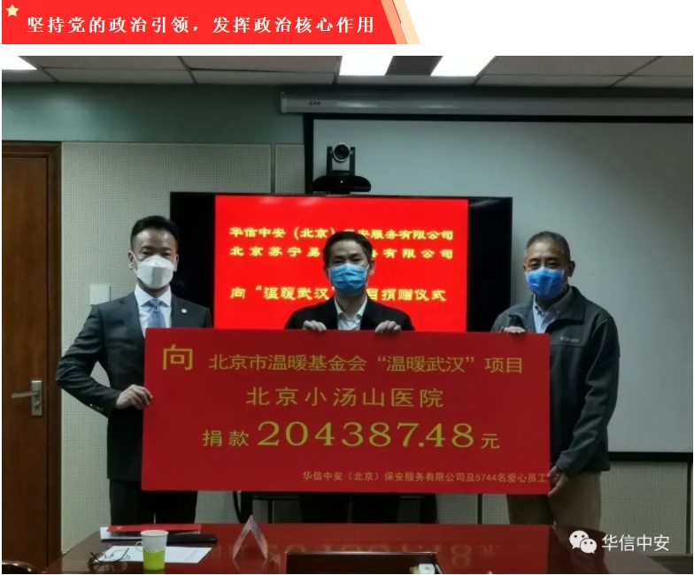 华信中安党委始终坚持党建引领为中心,持续开展思想政治工作,党组织的凝聚力不断增强,党员的先锋模范作用突显,促进了员工队伍稳定和服务质量的提升,赢得了客户信任与支持。2020年抗击疫情,华信中安党委提高政治站位,承担主体责任,号召各级党组织和全体党员把抗击疫情作为政治任务去完成,做到"危难时刻看党员、关键岗位有党员",带动全体员工共同筑牢坚固防线。乐鱼网页版登录入口投入经费600余万元,购买防控物资、建立隔离区、慰问基层官兵、捐助社会机构。2020年12月公安部评选全国保安行业抗疫先进,乐鱼网页版登录入口、党委书记林永强分别被评为先进集体和先进个人。集团行政管理中心主任刘珺珺在抗疫中勇挑重担,担当尽责,被丰台区评为"抗疫之星"。华信中安驻中国国际航空公司首都机场项目是管理部党总支管理二部党支部覆盖单位,党支部书记郑兴带领13名党员主动站在防控最前沿,亮明身份,树立标杆,200多名保安员毫不畏惧,守土尽责,确保了国门安全,受到国家民航局和国航领导高度评价。海外党总支倡议境外党员危难时刻站出来,树立旗帜、标杆,坚守境外海上、陆地各个战场的赵希松、周金魁、余峰、姚志、谷宇鑫等党员以疫情为命令,以防控为义不容辞的责任,严格落实集团部署和客户要求,确保了自身安全和服务客户安全,受到中国驻外机构和企事业单位领导高度赞扬。