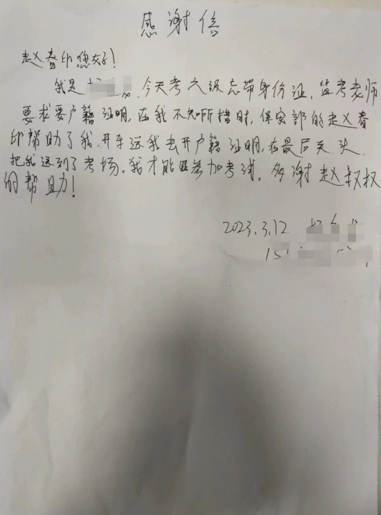 2023年3月12日,正是重庆交通大学全国英语四、六级考试的日子。下午2点50分,一个同学急匆匆地跑到一号门请求帮助,称自己忘记带户籍证明,无法正常参加考试,而考场封场时间为3点,时间十分紧迫。班长赵春印了解情况后,立即开车带该同学去保卫处七公里派出所办公室开具户籍证明,又热心送同学去考场,顺利参加了英语考试。